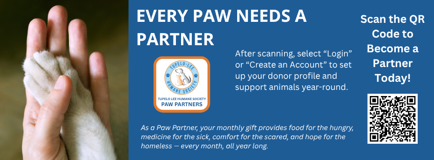 At Tupelo-Lee Humane Society, every act of compassion helps change a life. The Paw Partner Program allows you to make a lasting impact on the animals in our care by becoming a monthly supporter.